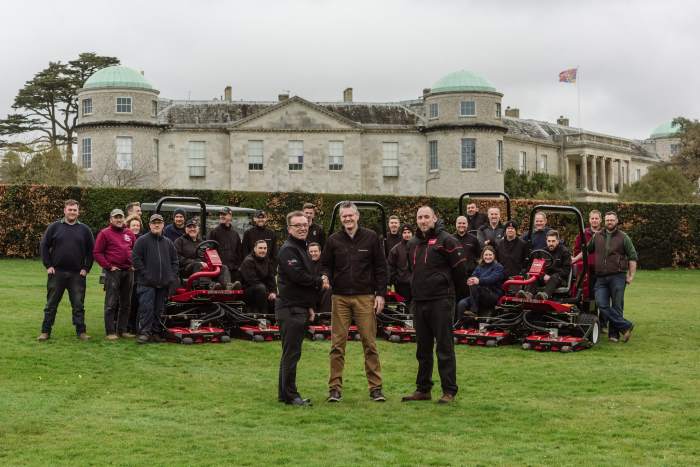 Pictured above: In front of Goodwood House stands Phil Helmn, centre front, shaking hands with Reesink’s Larry Pearman, and Jon Cole, right, with a large proportion of the 35 gardeners, groundsmen and greenkeepers at the estate.