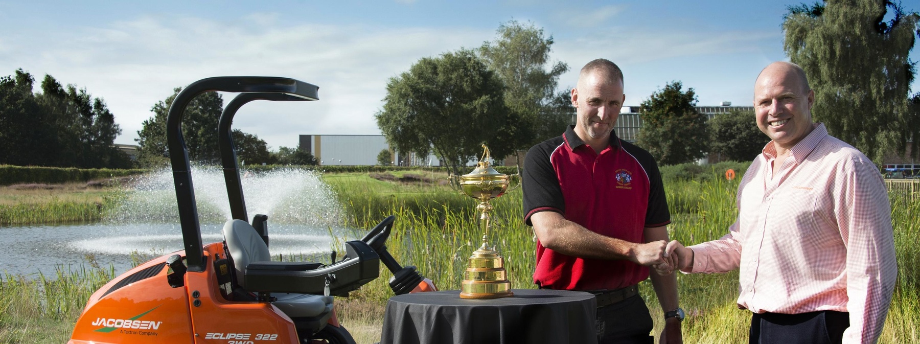 Pictured top: Graham Brumpton, Ipswich Golf Club Course Manager (right) with Will Carr, Ransomes Jacobsen’s Golf Sales Manager, and The Ryder Cup trophy with the Jacobsen Eclipse 322