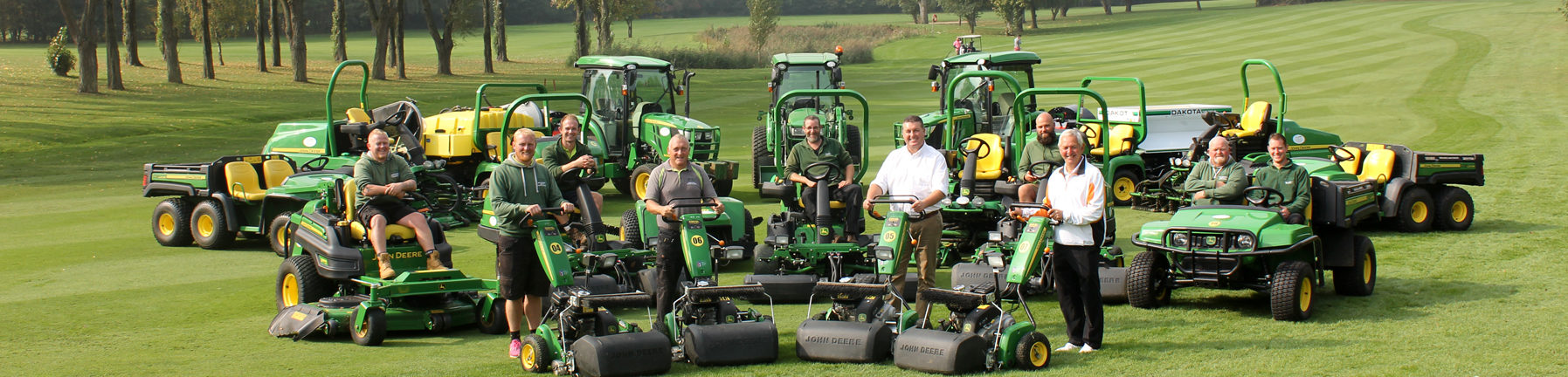 The package covers 26 John Deere machines, including PrecisionCut and TerrainCut walk-behind and ride-on mowers for the greens, tees, approaches and rough, compact tractors and a front loader, Gator utility vehicles, an amenity turf sprayer and a bunker rake, plus ancillary equipment.