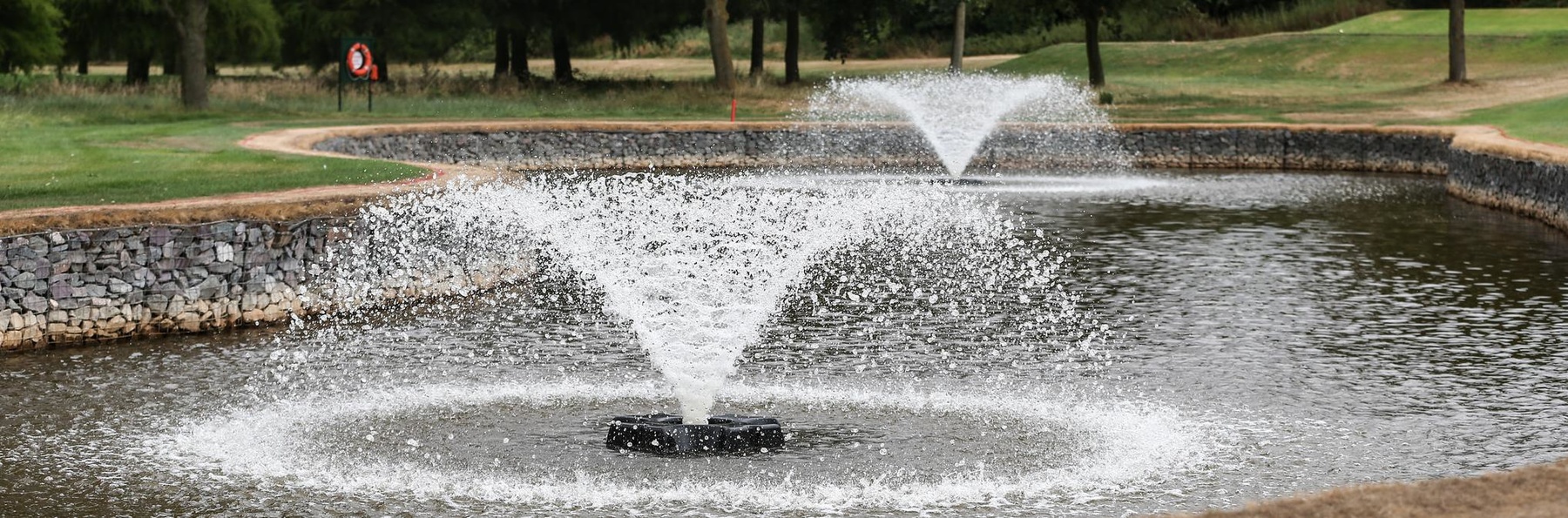 Nigel, and head greenkeeper Kevin Armstrong, chose two Otterbine Sunburst aerating fountains, from UK distributor Reesink Turfcare. Both are three horsepower units but one has a one horsepower impeller for the smaller end of the lake and the other has a two horsepower impeller for the wider end. The reasons for these choices were primarily aeration, to the keep the water clean and clear all year round, and secondarily for aesthetic purposes.