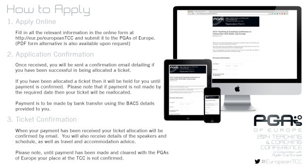 Registrations will be taken using an online submission system on the TCC hub at http://eur.pe/europeanTCC Tickets are available on a first-come, first-served basis and are open to PGA Professionals Members of a recognised PGA.