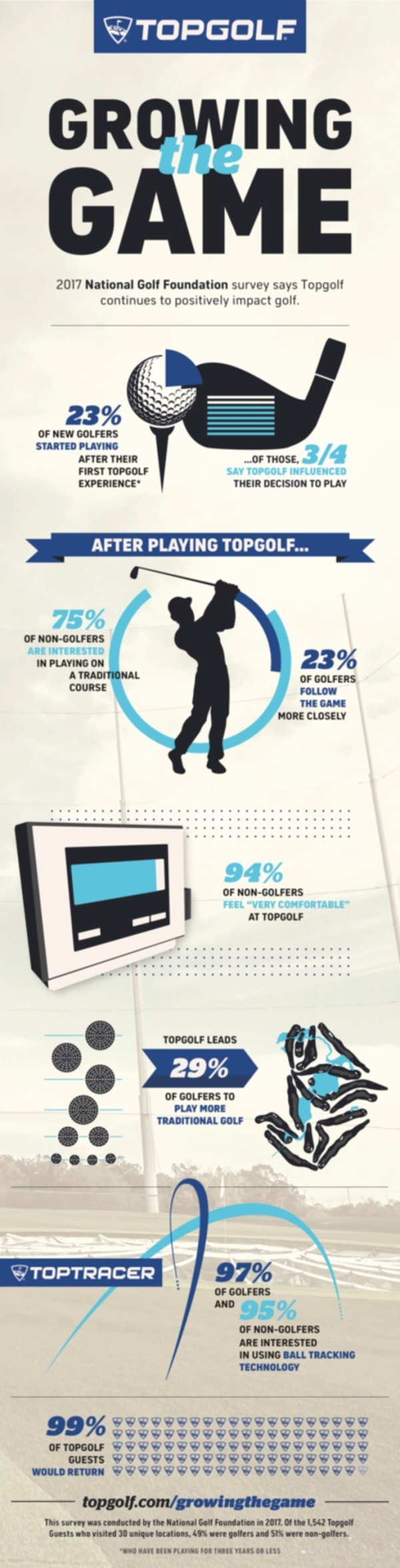 “The NGF survey results are encouraging as we collaborate with our partners at PGA of America, PGA TOUR, LPGA and others to grow the game,” Anderson said. “Through Toptracer and other innovations such as Topgolf Crush, Topgolf Tour, Topgolf Swing Suite and more, we’re constantly striving to make golf more approachable, accessible and, most importantly, fun.”