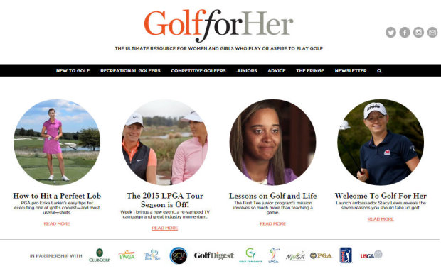 A revolutionary collaboration with the major entities in golf, the resource site is designed to attract and support female golfers of all ages and abilities. Contributing organizations include the LPGA, the PGA of America, the PGA TOUR, The First Tee, the USGA, ClubCorp, the Executive Women‟s Golf Association, Golf Digest and GOLF 20/20, a subsidiary of the World Golf Foundation.