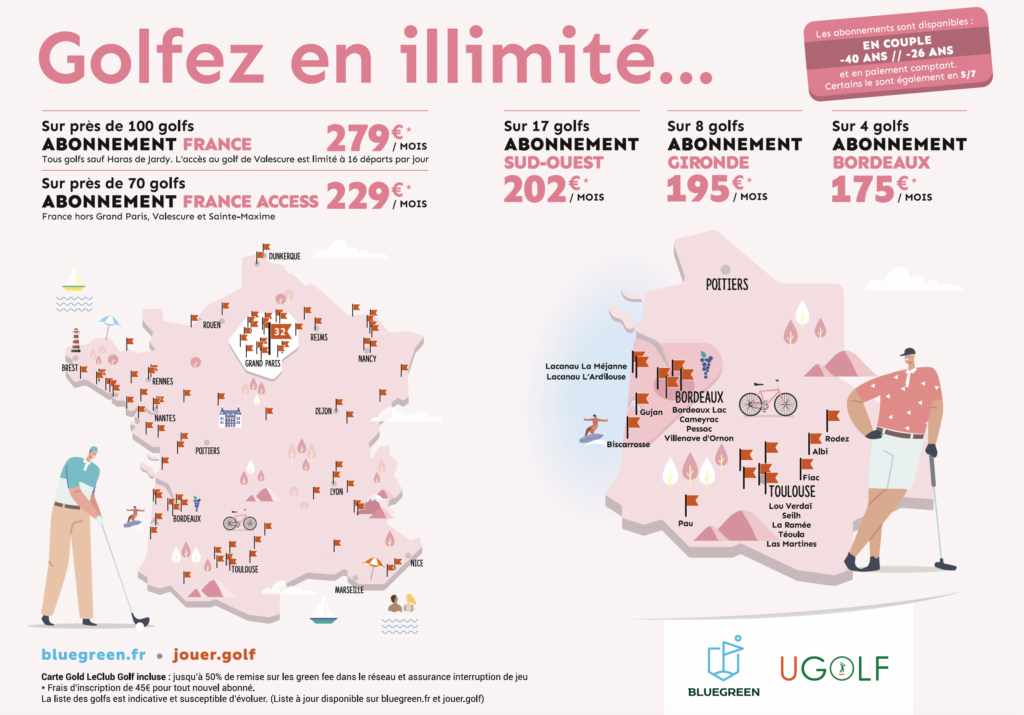 We also have other regional memberships within France, so if you only want to play our four clubs in Bordeaux, for example, the fee is €175 per month. Or to play all 17 clubs in the south west region it will cost €202.