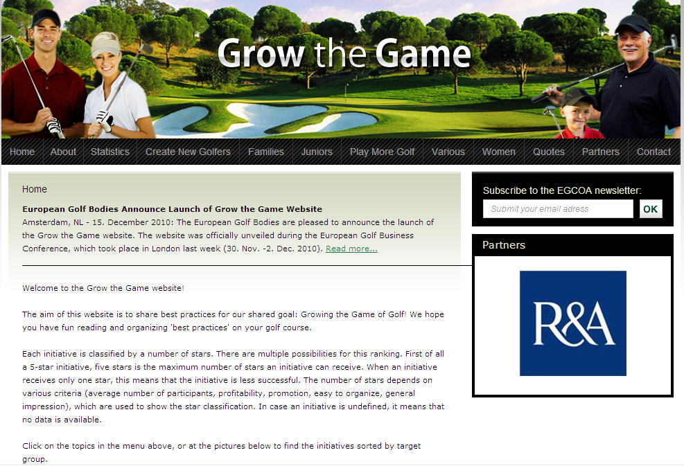 The Grow the Game project and website (www.growthegameofgolf.org) is an idea of the European Golf Bodies and an initiative of the EGCOA, and is based on best practices and feed-back gathered from professional players, course owners and operators from all over the world. The project and website have been led by EGCOA Intern, Sharon Schoof.