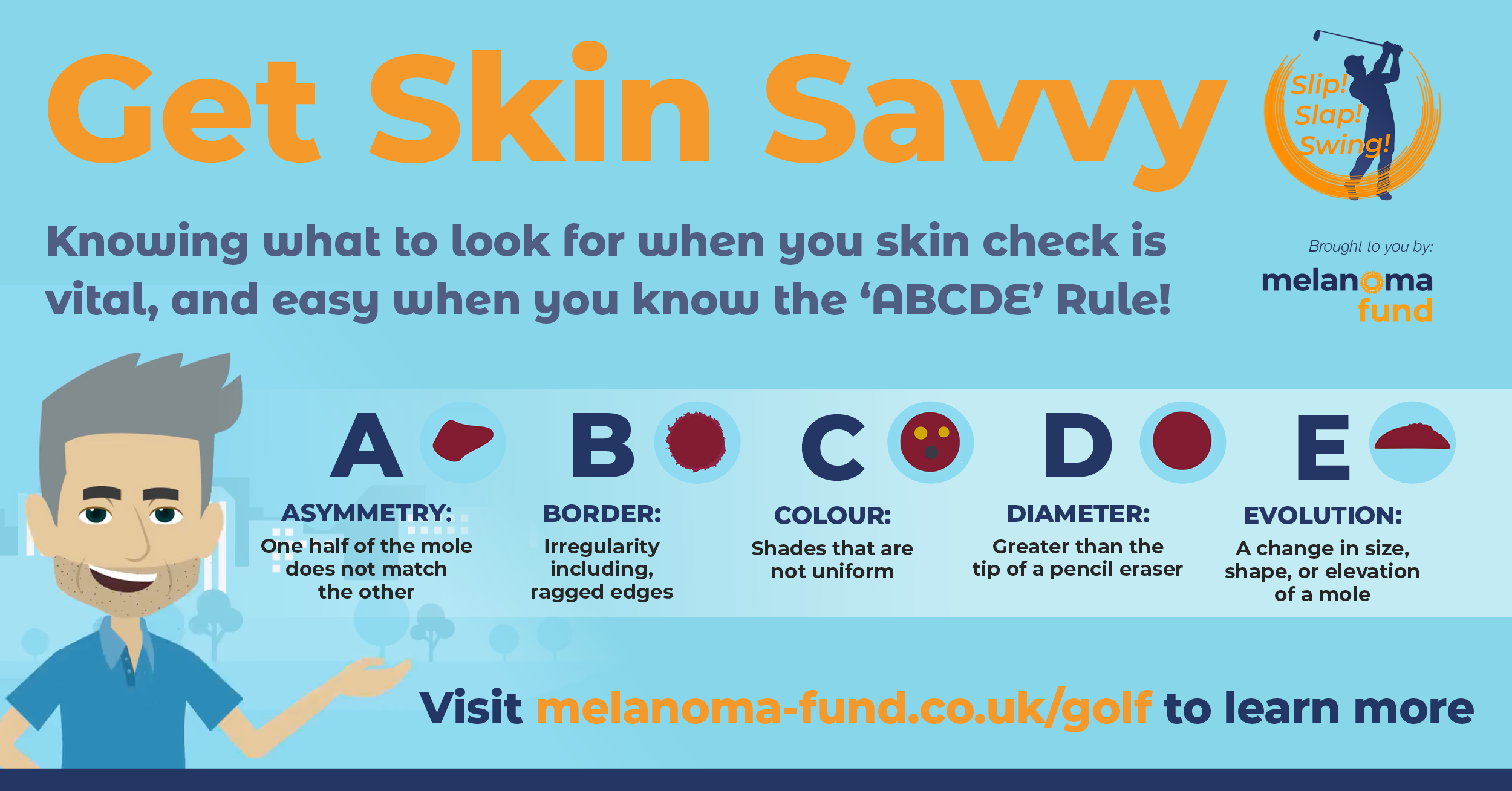 This summer, the Slip! Slap! Swing! campaign persuaded golf to get sun savvy. This autumn the Melanoma Fund is back encouraging golfers to get skin savvy, by carrying out a monthly skin check to help avoid late detection of melanoma, a problem more prevalent in men.