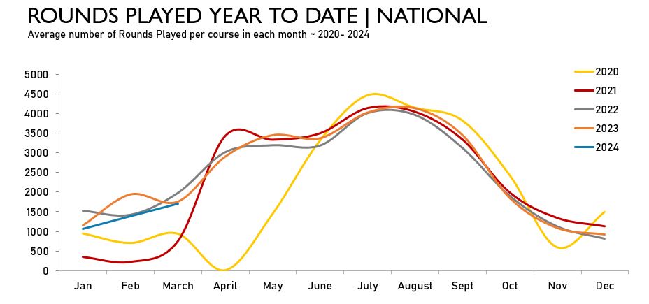 “A few things are important to bear in mind,” noted Richard Payne, joint managing director of Sporting Insights. “First is the relative strength of 2023 and 2022 when looking at any downward shifts in performance. For March 2024 to finish 3% down year-on-year is a decent result that should not be interpreted as cause for pessimism as golf moves into the critical summer window, and they are still well up on 2019 figures.