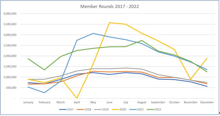 Over the course of 2022, BRS Golf processed 24.7 million member rounds. During both 2020 and 2021 there were Covid restrictions in some form, making it difficult to get an accurate year-on-year change in the number of rounds played. However the lack of post lockdown booms in golf this year has allowed us to see a steady run of member play and to get a more consistent picture of the level of member play by month.
