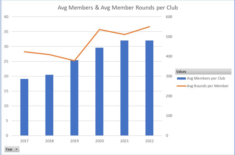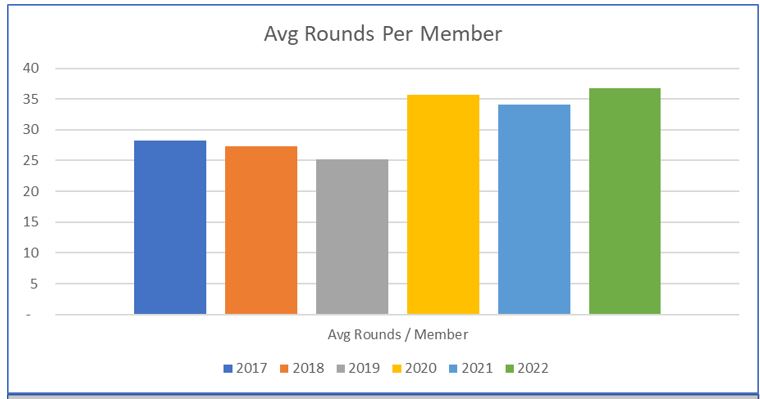 At the heart of the number of rounds played is the number of golf club members. Over the last three years there has been a surge in the level of members at BRS Golf clubs. At the end of 2019 we had 533,000+ registered members using our platform. By the end of 2022 we had more than 673,000 registered members. The number of clubs using BRS Golf technology has remained fairly flat over the same period. The data shows that average number of members per club, and how often the members are playing, has increased significantly.