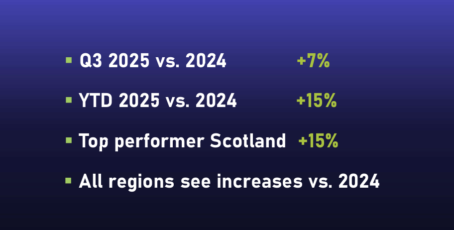 Growth was consistent nationwide for the quarter, with all England, Scotland and Wales reporting increases each month. Scotland led the way, achieving double-digit growth throughout the quarter, including a remarkable +23% rise in August over 2024.
