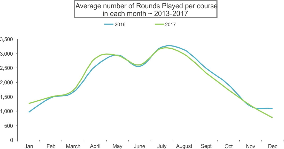 The drop over the final three months of the year also contributed heavily to the fact that rounds played for the full year were fractionally down nationally. Despite this, year-end figures for Scotland, the Midlands and the South regions all showed stability or slight growth compared to 2016.