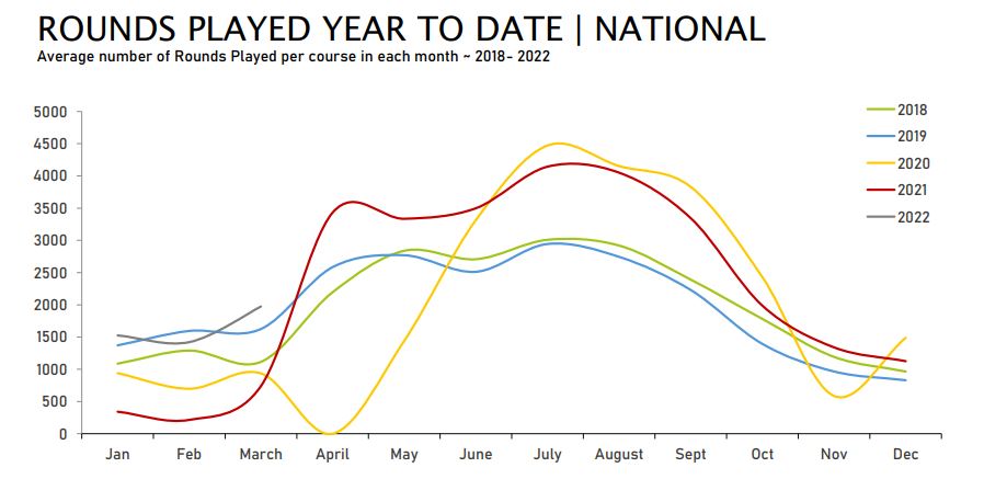 ‘Rounds played’ comparisons with Q1 2021 and Q1 2020 are not comparable because of widespread lockdowns and course closures in the first months of last year and the second half of March 2020.