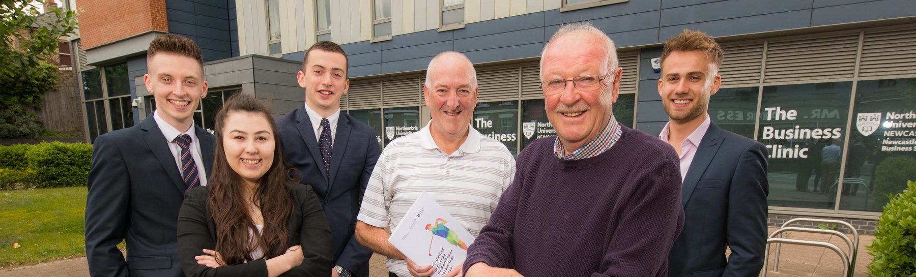 Pictured top from left: Northumbria University business students James Smith, Abby Wiffen and James Sopp with Peter Jobe and John Hall from the GCMA Northern Region and fellow student Fraser Mai