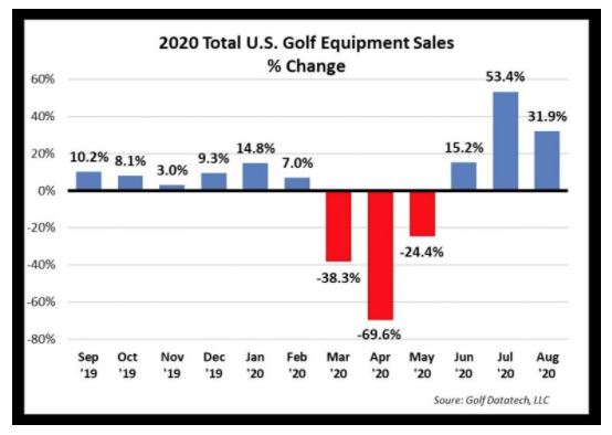 In total, U.S. golf retail equipment sales for August 2020 were $331 million, compared to August 2019, which were $251 million, and the previous record year of August 2006, which were $287 million.