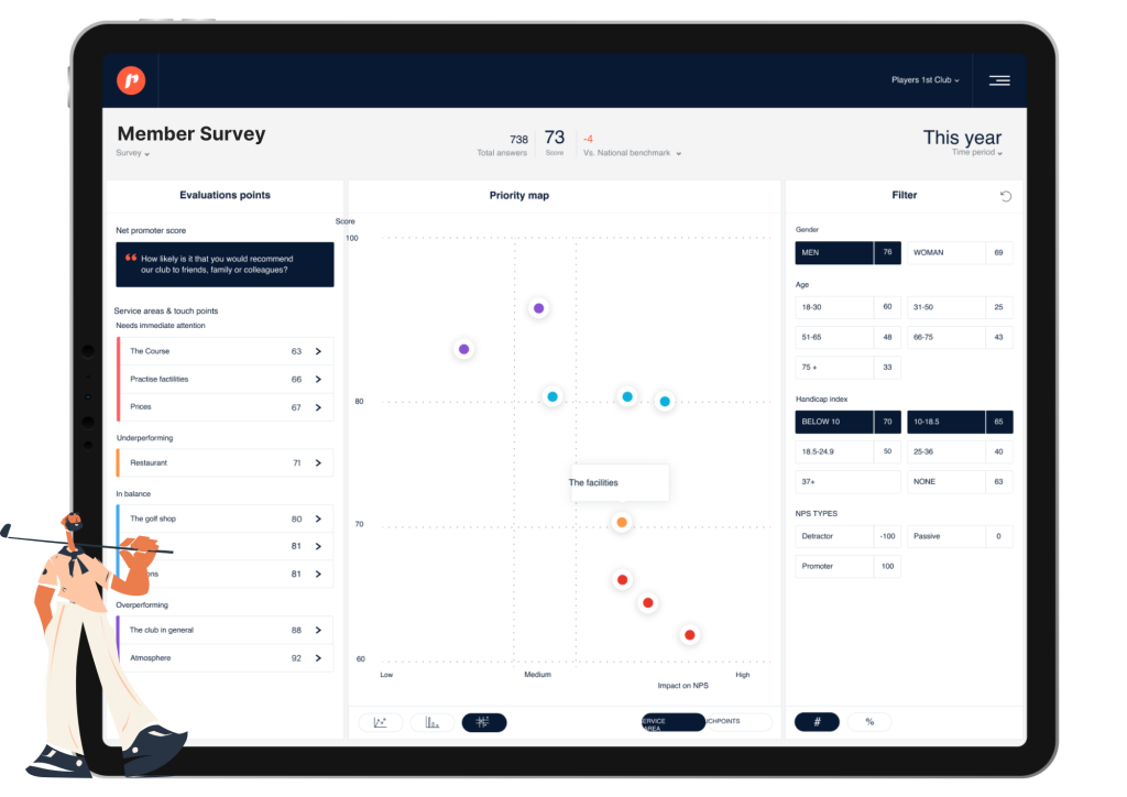 The clubs benefitted from using the golf specific feedback tool to customise the survey questions and responses relevant to their course and facilities. The results dashboard also provided benchmarks based on other golf clubs which also helped club users interpret the feedback.