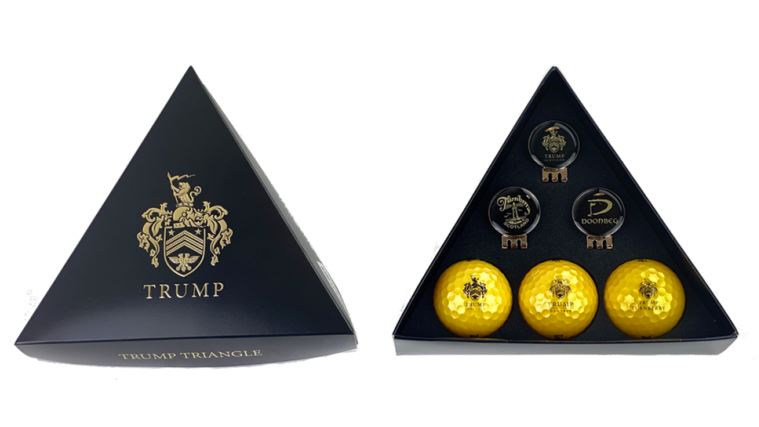 Promoted as ‘The Trump Triangle’, the customised box features three Volvik Solice 3-piece golf balls with a metallic gold finish. They are understood to be the first performance golf balls to be produced in the bright gold colour for general sale.