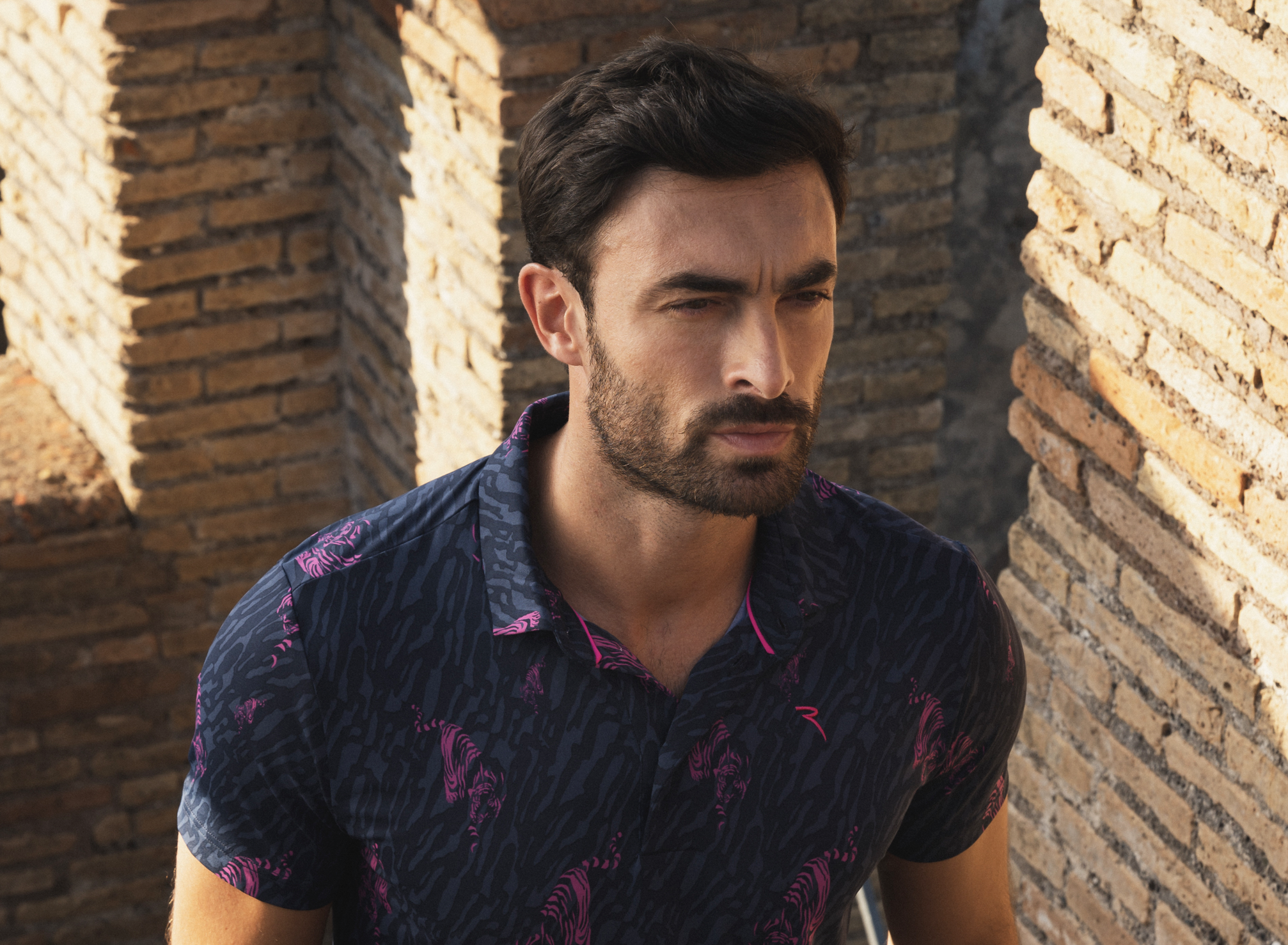 Gladiator-inspired prints on the men’s collection of polo shirts see tigers and Roman shield patterns feature all-over these statement pieces – the very same Roman-nostalgic patterns are presented in a variety of garments that offer an understated yet nuanced style which can be easily worn on and off the golf course.