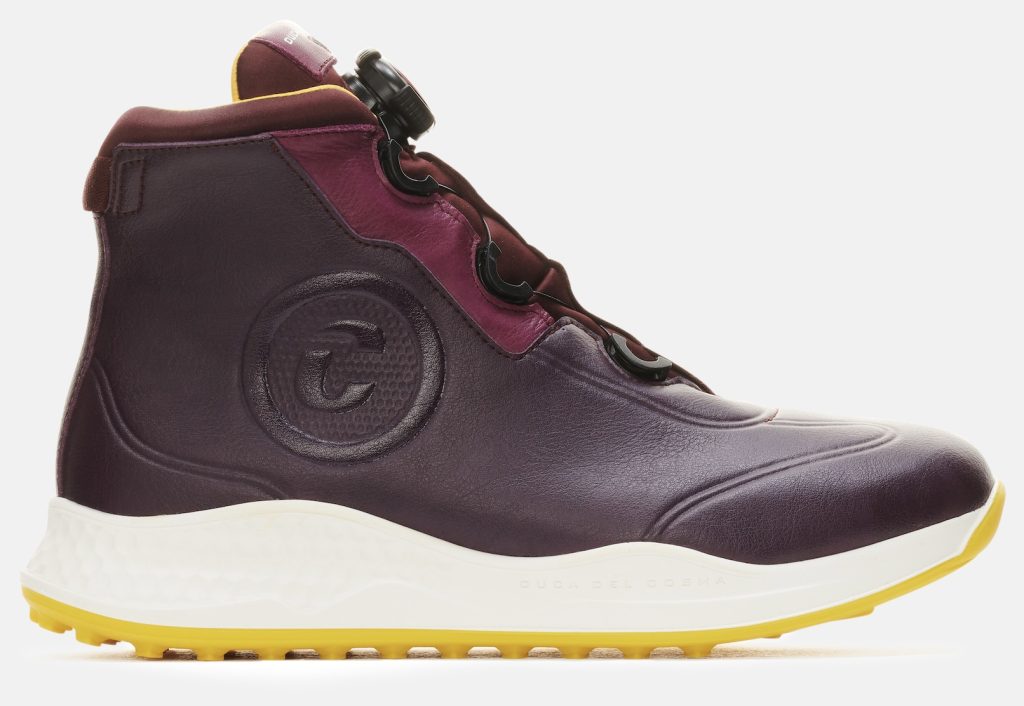 Offering a contemporary look, the TOSCANA boot incorporates the Quick Lacing System for a supremely snug fit, as well as the lightweight and recyclable Airplay 12 outsole to gives this modern boot a distinctively refreshing feel like no other golf shoe on the market. It is available in Aubergine with a vibrant contrasting Yellow sole.
