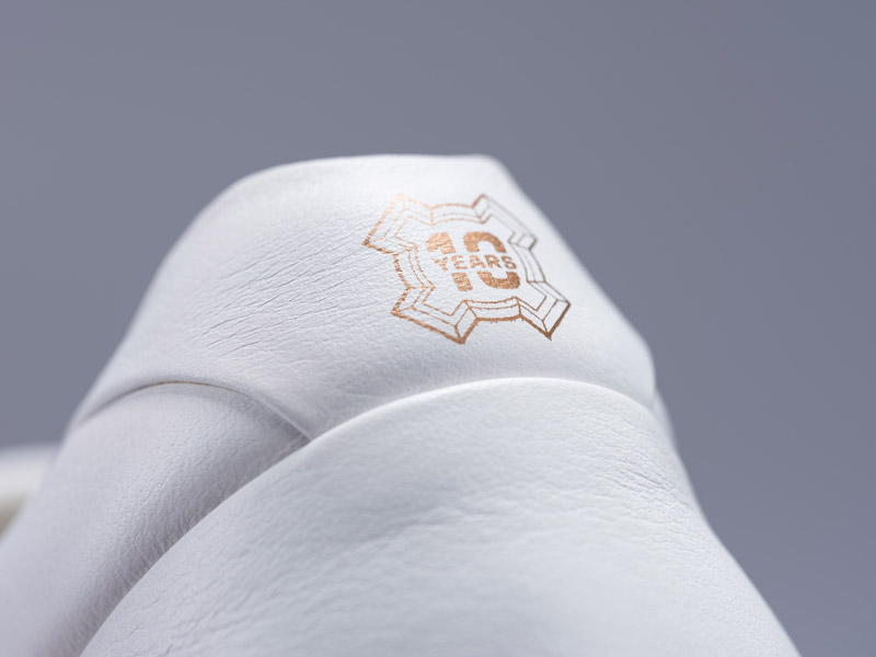 Cosmetic additions include bronze detailing on the lace ends and two eyelids, and ‘HYBRID 10’ logo in bronze screen print on the heel and a commemorative shoe box and key ring.