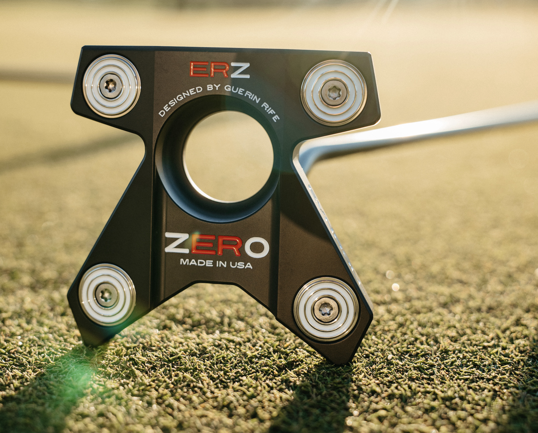 The golf ball-sized hollowed-out centre is surrounded by a bold, white, ball-sized ‘zero’ against the black anodized aluminium body. By adding a white centre line the golfer is rewarded with effortless alignment.