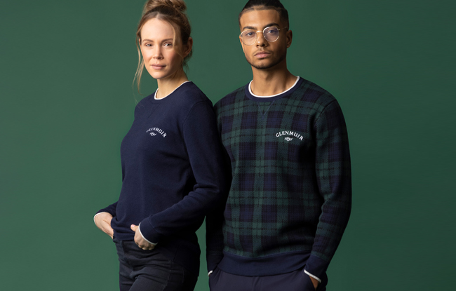 Throughout the collection the colour pallet reflects Glenmuir’s heritage, with Bottle Green reflective of the beautiful Scottish countryside; navy blue, a staple classic colour throughout any Glenmuir wardrobe; and Light Grey Marl, which represents their luxuriously soft fibres. In addition to this the Black Watch Tartan ties the collection together beautifully, combining the colours as well as the inspiration behind the collection.