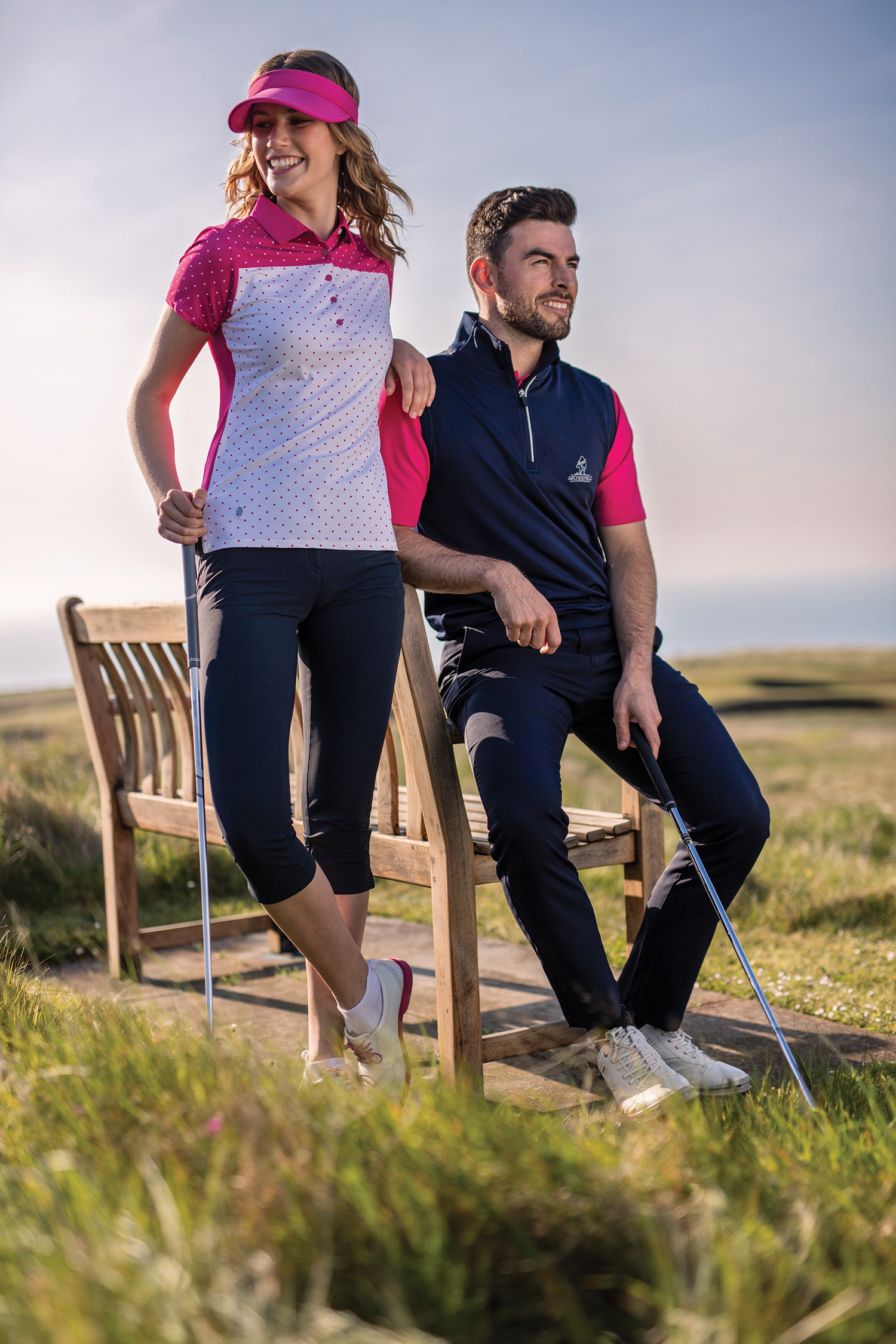 An elegant Rose print in Magenta and Navy has been introduced to the comprehensive Glenmuir ladies’ trouser collection which includes Kendra plain capris, Matilda printed capris, Alma skort (all RRP £70) and Aubrey visor (RRP £20) to merchandise with performance polo shirts to create contemporary refined golfing outfits.