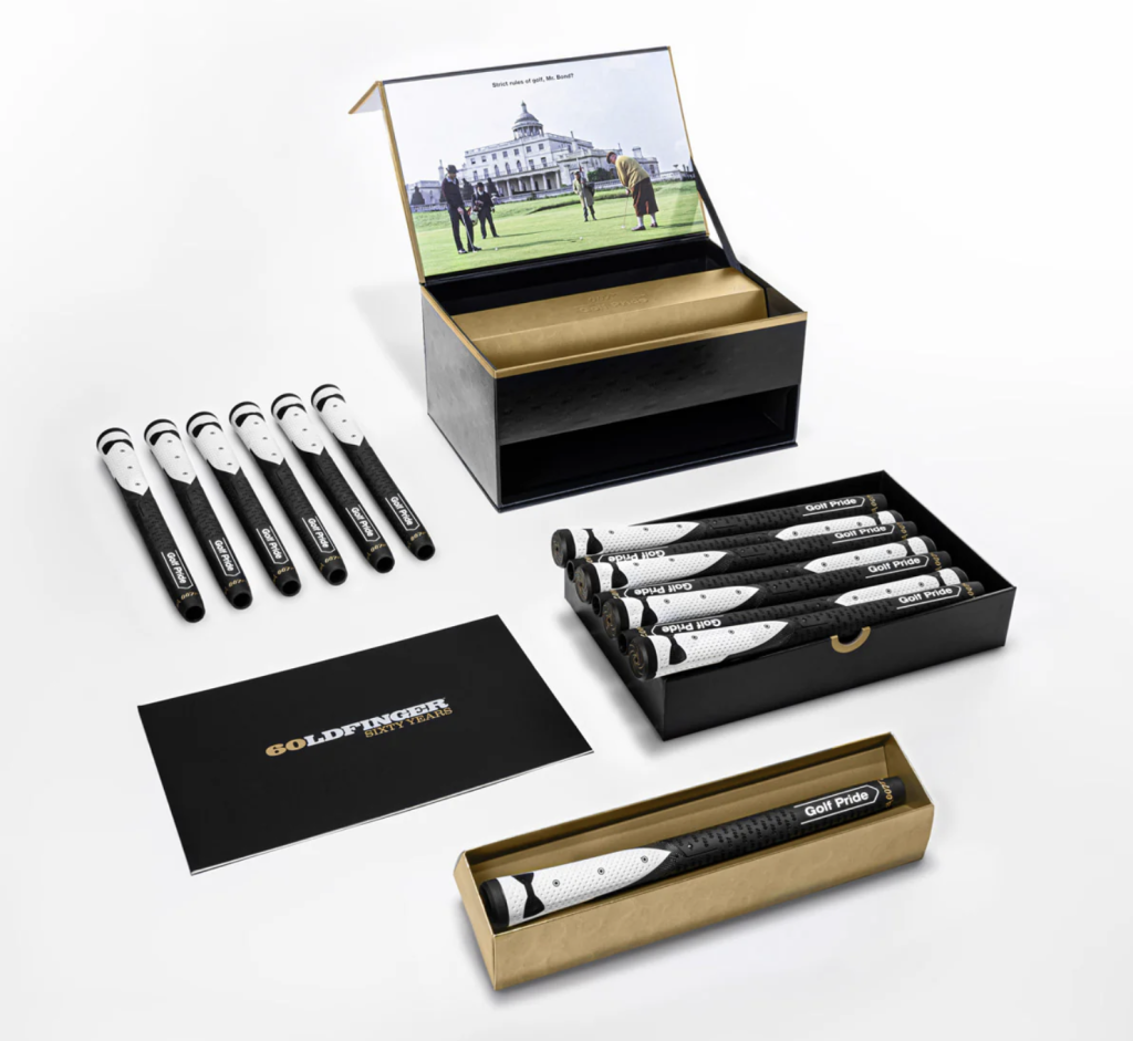 Paying homage to the 60th anniversary of the 1964 film Goldfinger, this kit includes 14 custom grips and a specially crafted gold bar collector display. Golf Pride applied its vast experience with design and material innovation to build the base performance for this product, before tackling the fun challenge of bringing to life a grip that embodies the cultural phenomenon that is James Bond.