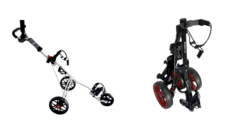 Offered in a choice of black or white, the MAC TEC 3-wheel trolley folds down small enough to fit in most car boots with ease alongside a full golf bag and combines the durability of stainless steel construction with a sporty design.