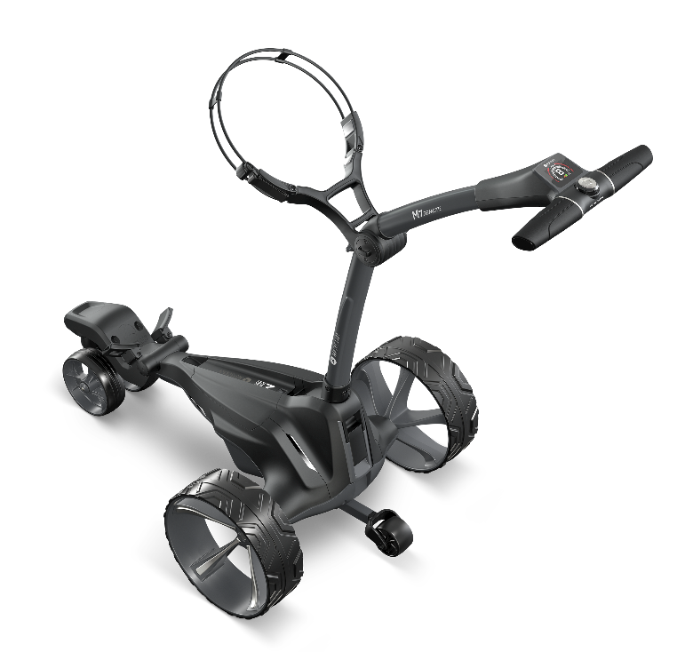 Additional features include a next-generation high-power 28.8V system, powerful 230W DHC twin motors, dual 360° rotating front wheels for enhanced manoeuvrability, an LCD widescreen display, a USB charging port, and a remote handset lock function for added security and convenience, plus the exclusive EASILOCK bag-to-trolley connection system that removes the need for a lower bag strap when paired with a Motocaddy golf bag.