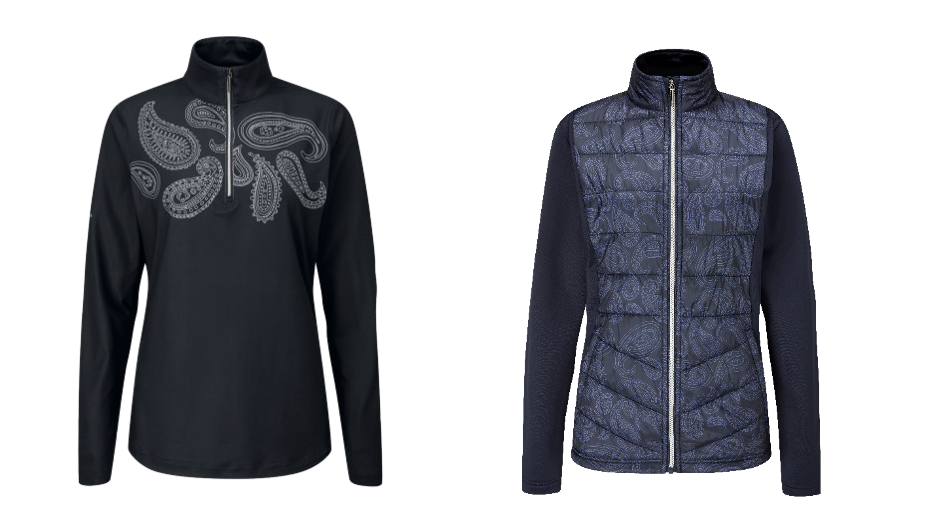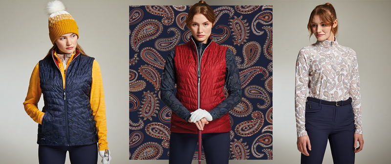 The paisley print design also extends into two long-sleeved performance tops. The Evangeline is a full body paisley print, available in two colourways – Pristine and Navy – whilst the Ainsley features the paisley print placed at the upper body and is available in Navy/Pristine and Pristine/Navy. Both styles are engineered from peached fabric with enhanced softness for moisture-moving comfort in all conditions and provide female golfers with a bold, expressive and premium look. When used as a layering piece, both styles combine with the Colette vest and the reversible Paisley Neck Warmer, providing a complete Autumn/Winter look.