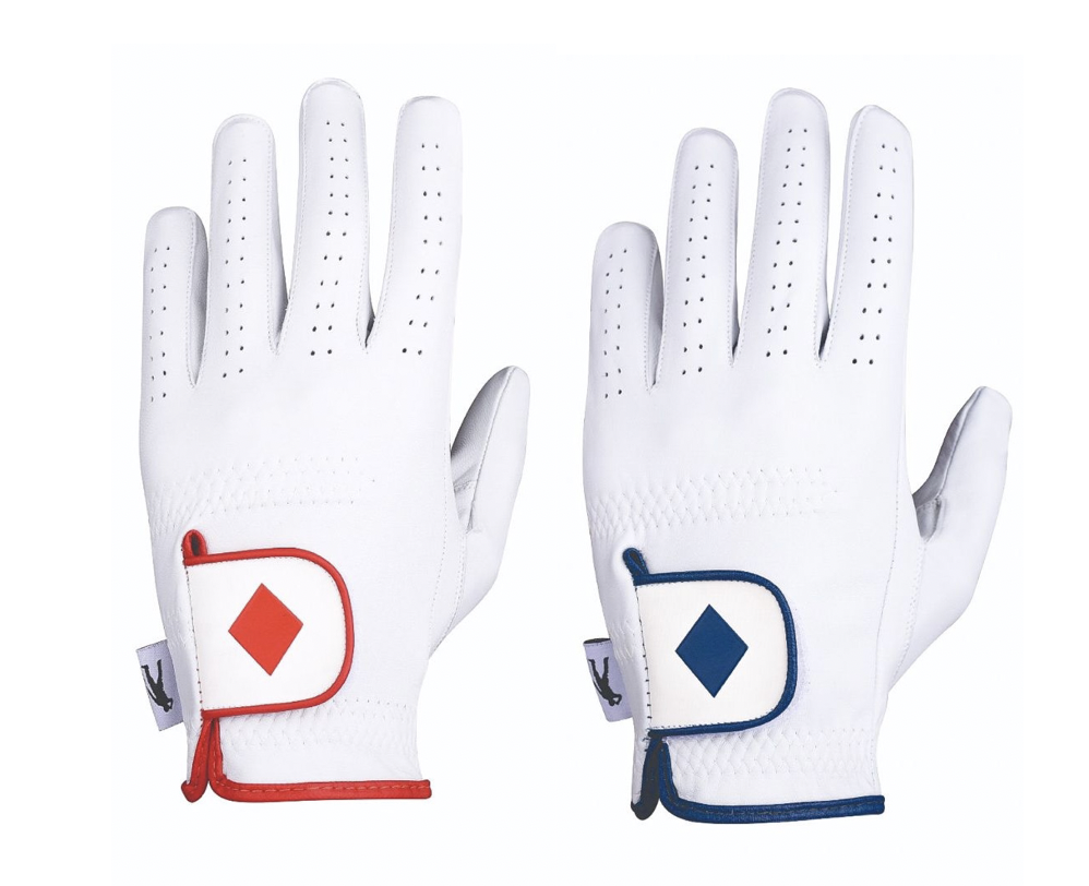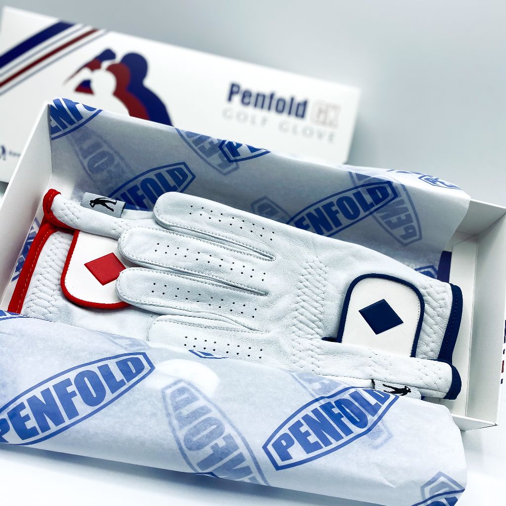 The Penfold Seve glove set includes two GX cabretta leather gloves, one featuring red piping, the other blue. Both feature the Penfold diamond logo on the strap and the iconic Seve Ballesteros silhouette logo on the label.