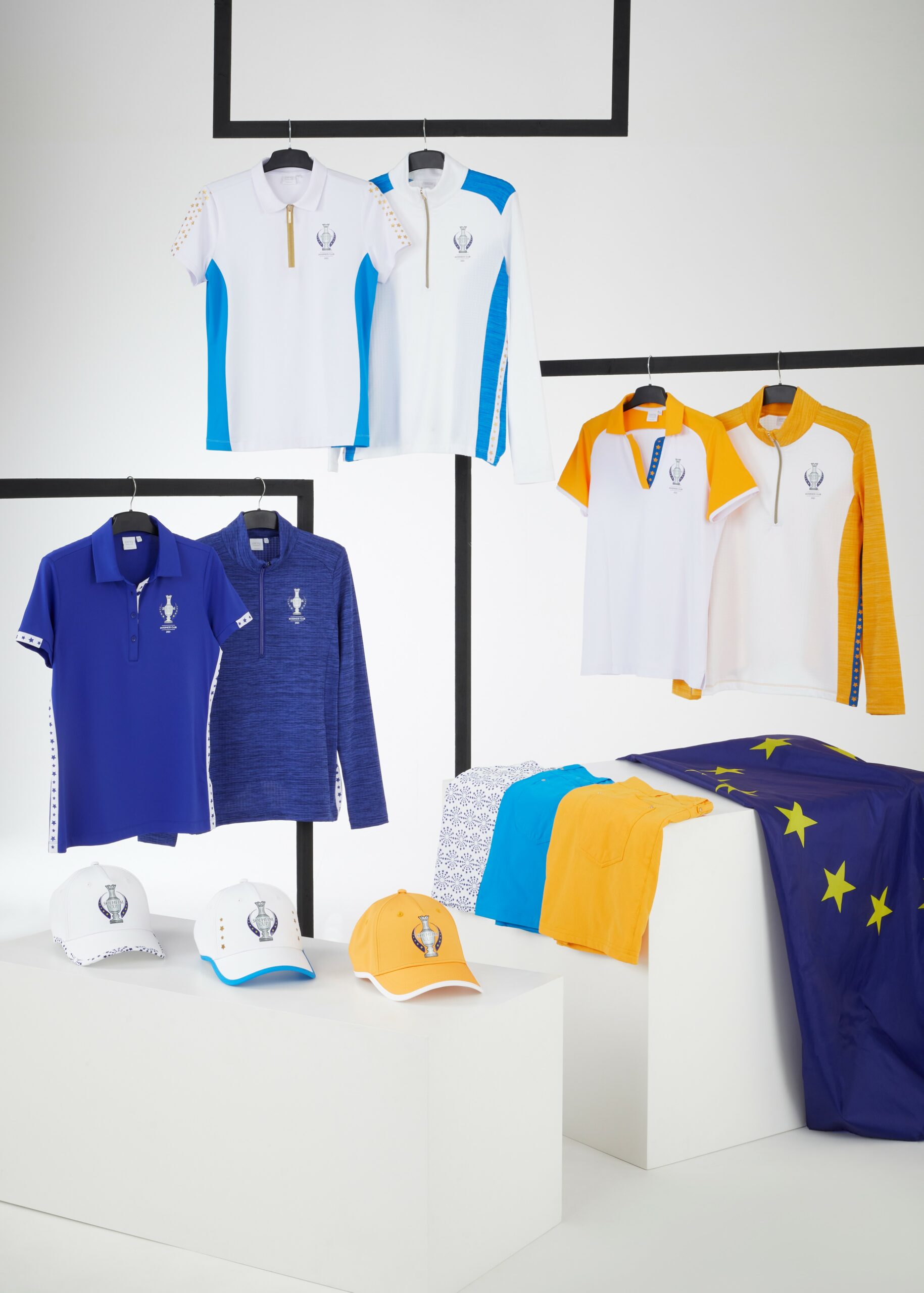 The second outfit is based on the vibrant colours of the European flag but given a contemporary twist, through the use of a slightly warmer citrus yellow shade, while still incorporating the traditional blue and gold stars through trims and rivets, which is sure to make a strong European on-course statement for day two of the contest.
