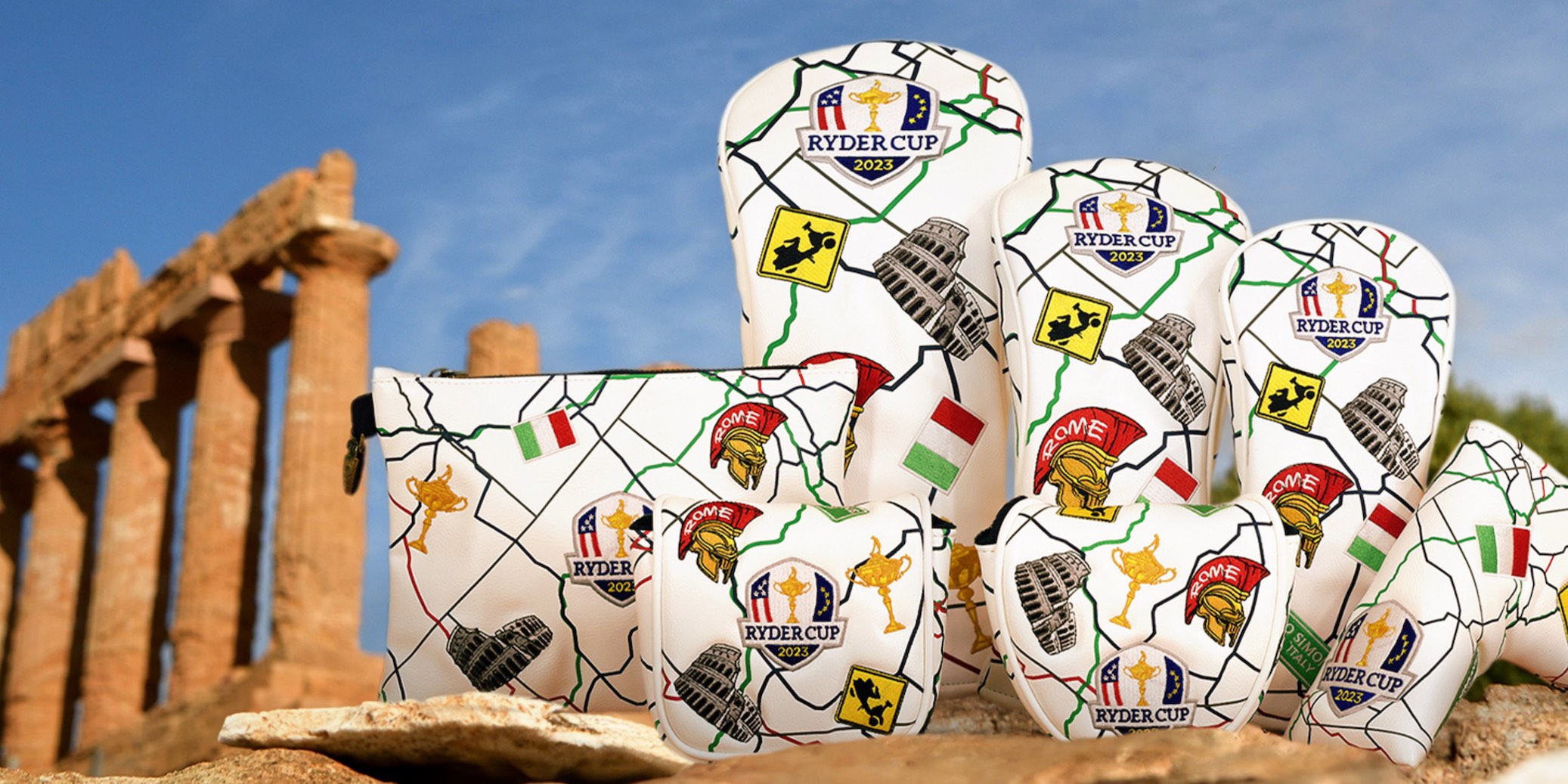PRG’s ‘All Roads Lead to Rome’ collection features a striking, colourful design with iconic Italian images, including the colosseum and a Vespa scooter which, together with Ryder Cup motifs, overlay an eye-catching map-style background. The collection includes headcovers, towel, tote bag and ball markers.