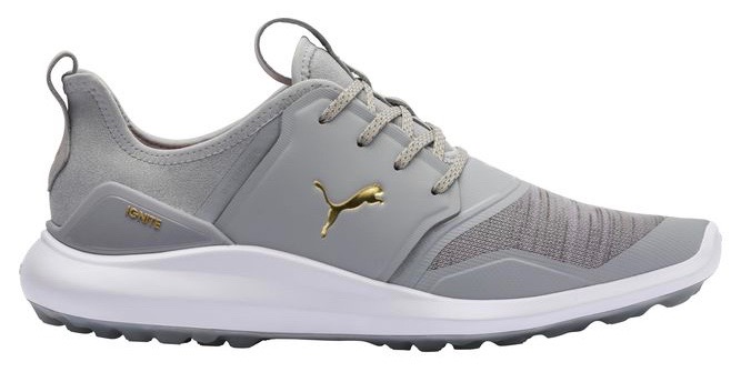 The IGNITE NXT PRO offers an alternative to the Performance Mesh + TPU construction of the other three shoes in the IGNITE NXT range, while still providing comfort, stability and traction. It boasts a microfiber upper with PWRFRAME reinforcement, and decoupled PWRCAGE pieces to provide a secure fit for golfers desiring less flex from their footwear. It is available in three colours – High Rise/Team Gold/White, Black/Team Gold/White and White/Silver/Gray Violet.