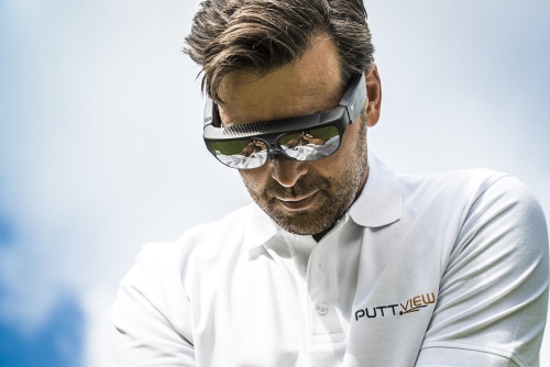 When playing outdoors, golfers wearing PuttView glasses can see the line and pace of a putt before they hit it, with a computer-generated display overlaid transparently onto the real world.