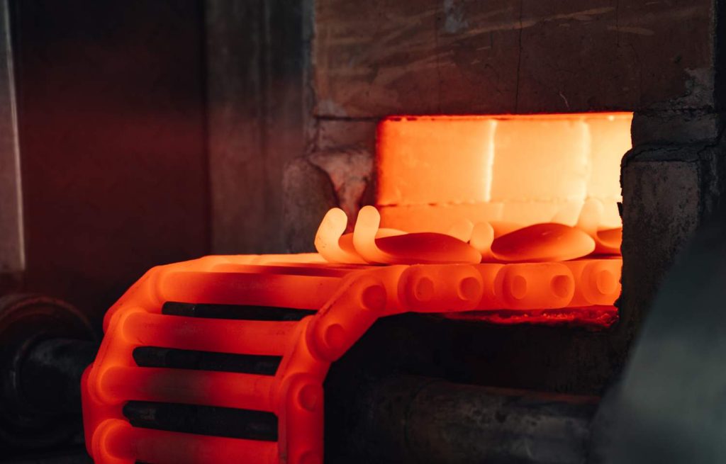 The process starts with a billet of soft carbon steel that is heated and bent into an L-shape. The piece then goes through a rough forging process where excess material is trimmed away, and the wedge begins to take shape.