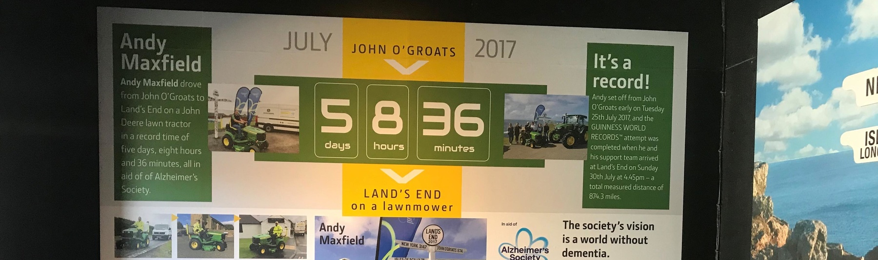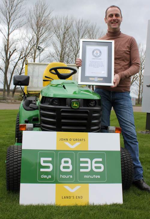 Prison officer Andy Maxfield’s amazing journey from John O’Groats to Land’s End on an unmodified lawn tractor has been officially recognised as a GUINNESS WORLD RECORDS® achievement. The story of Andy’s epic journey is featured in a new display at the Land’s End Visitor Centre in Cornwall, and also at the British Lawnmower Museum in Southport.