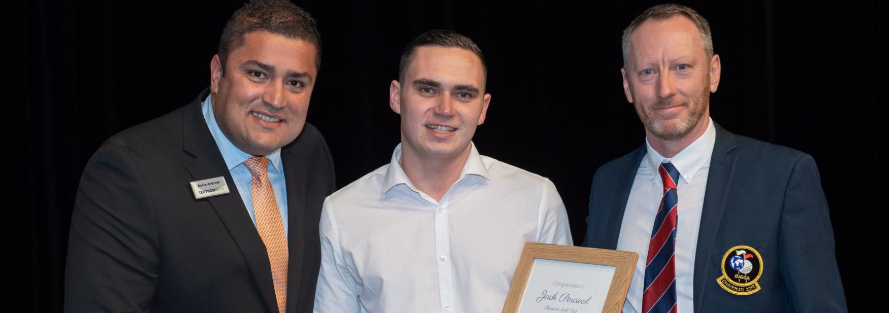Pictured above: Jack Percival with Textron’s Andre Andrade and BIGGA Chairman Scott Reeves
