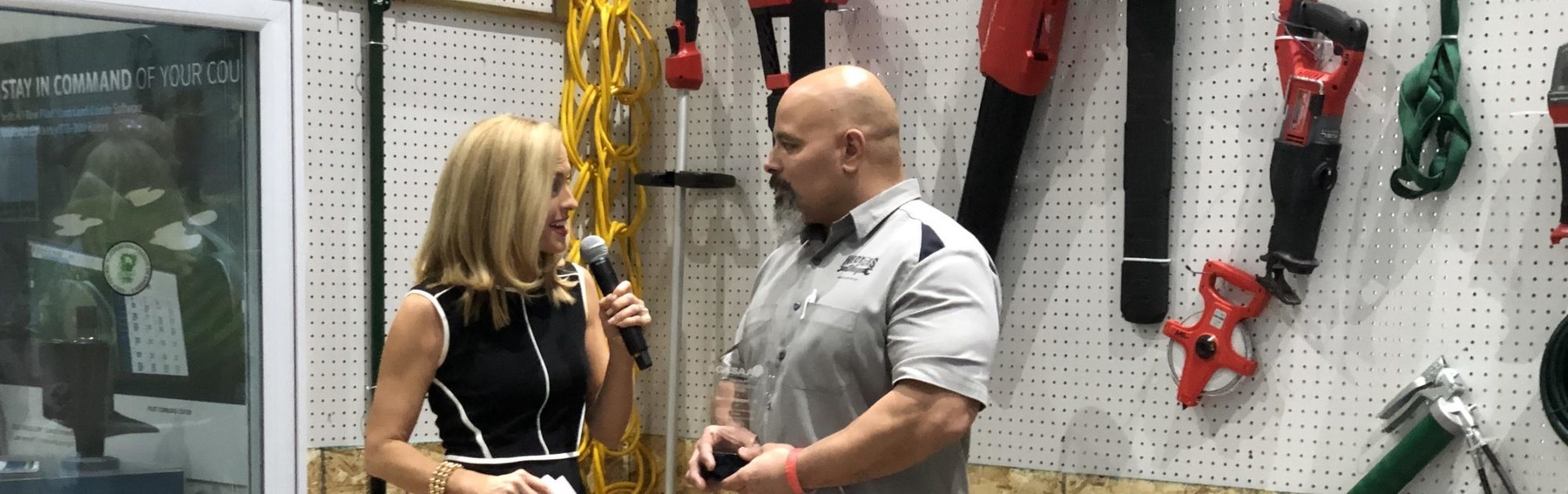 Pictured top: Edwin Budding Award presentation at the 2019 Golf Industry Show in San Diego. At left is Lauren Thompson of the Golf Channel, who presented the award to recipient, Hector Velazquez