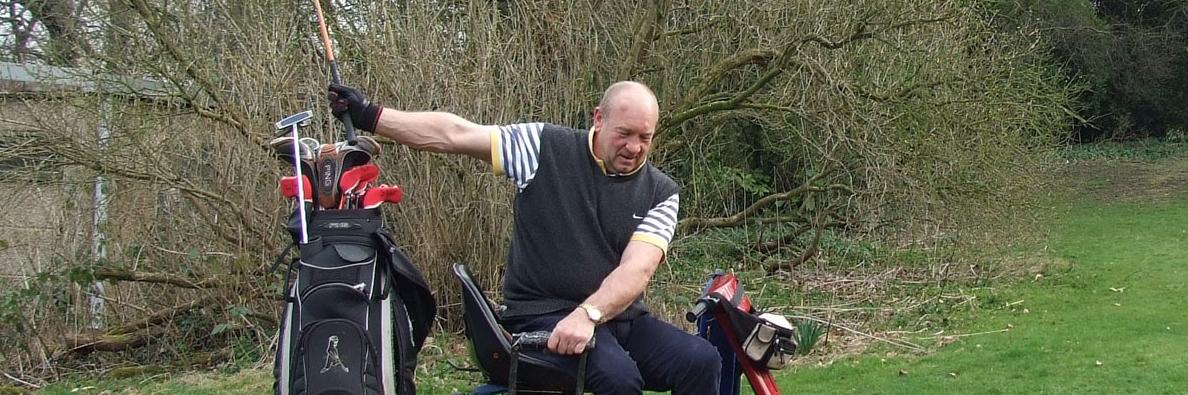 He plays off a handicap of 26, saying “Not bad for one arm and sitting down!”