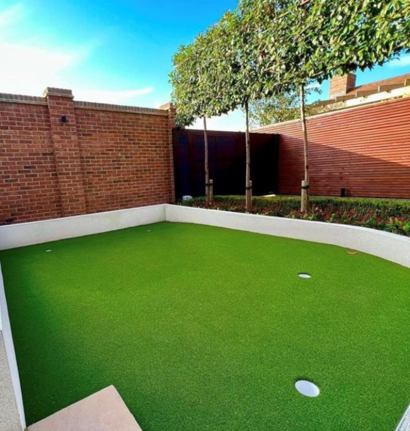 Measuring 11ft (3.5m) x 16ft (5m), Lewis’s enclosed home golf green optimises his outdoor space. It incorporates three holes, meeting his specific requirements for a left to right putt up the left side and straight putt up the right-hand side.