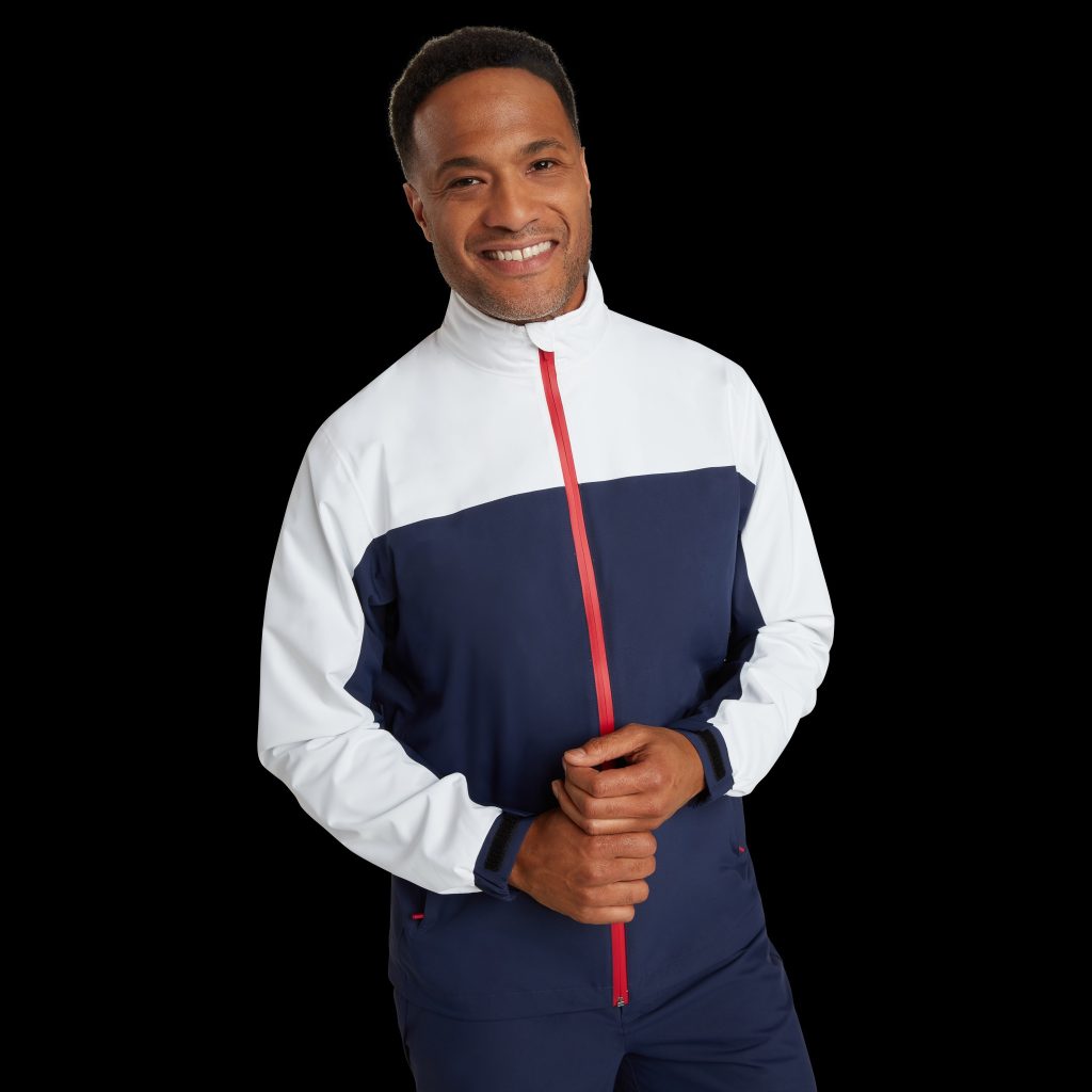 The Waterproof Rain Jacket (AM4073) comes in 3 colour combinations; Navy/ White, Chambray/Navy, Red/Navy. Each design carries two block colours. One colour features across the upper chest and down the outer arm and is contrasted with a second colour through the body and under arm area. Details such as the placement of the Golfman logo on the back yoke and the contrast zipper colour give the jacket a contemporary finish.