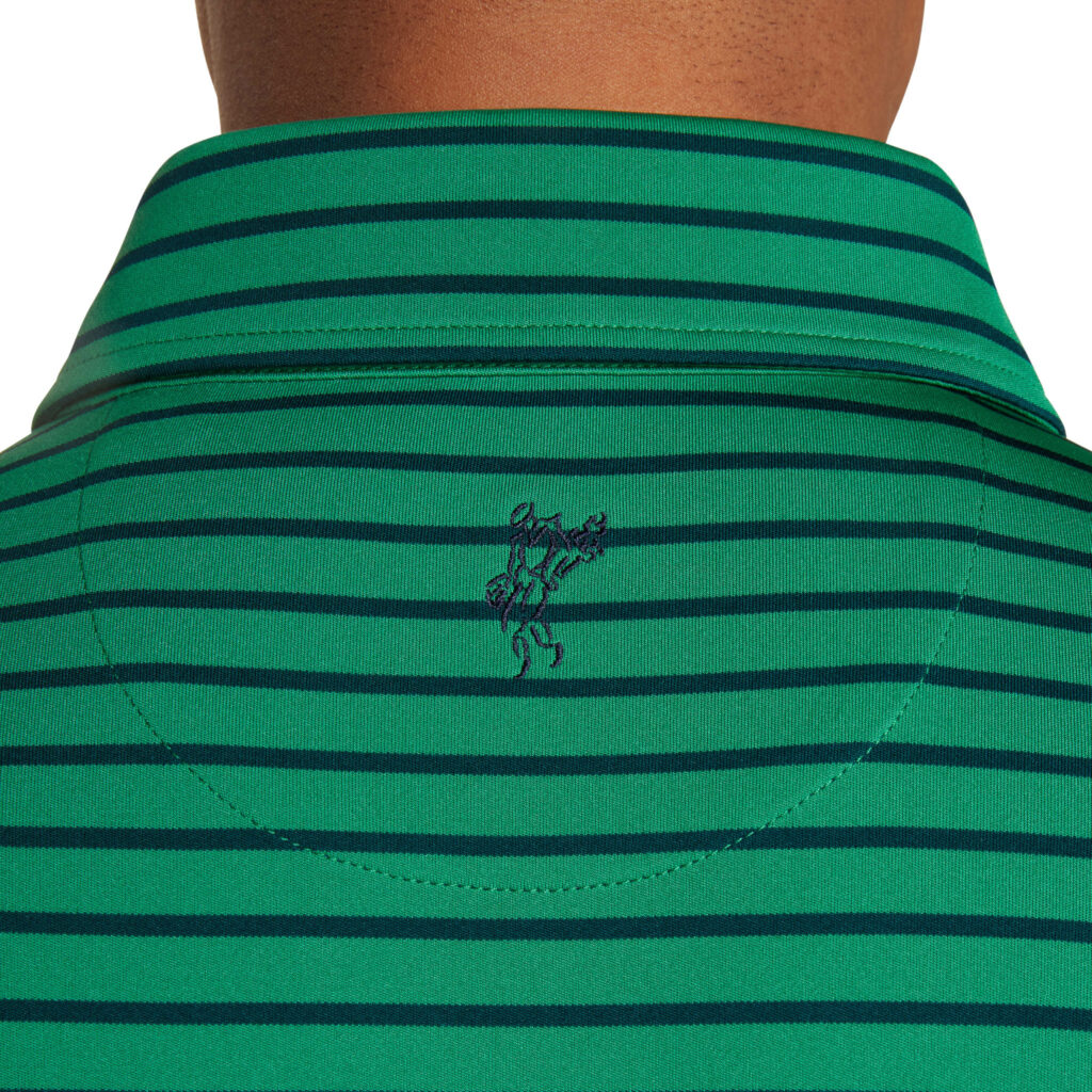 The Palmer Stripe is a technical polo in a Polyester/Spandex mix that carries a microstripe to the upper arm and chest, with a thicker delivery to the lower chest and sleeve for an interesting alternative to a classic stripe.