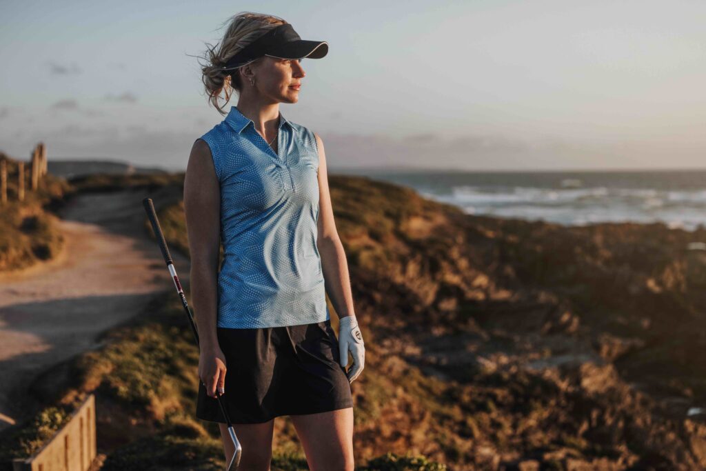 The contemporary MEG design and super stretchy MAYLA seersucker fabric shirt are two other top sleeveless styles for the hottest of days on the golf course, while the bold MELODY and two-tone MIRELLEshort-sleeve shirts can be worn both on and off the fairways.