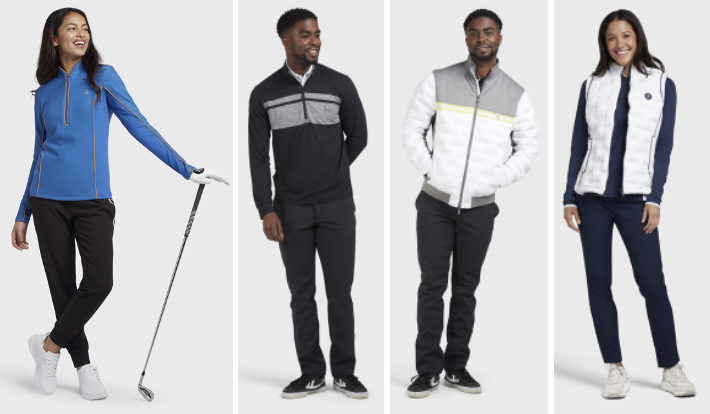 Key pieces include new insulated Puffers with PrimaLoft™ featuring durable micro-ripstop, water repellent fabric, and 600-fill power insulation with welded baffles. Puffers can be worn on windy days on the golf course or just around town!