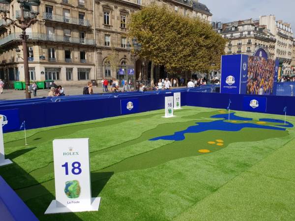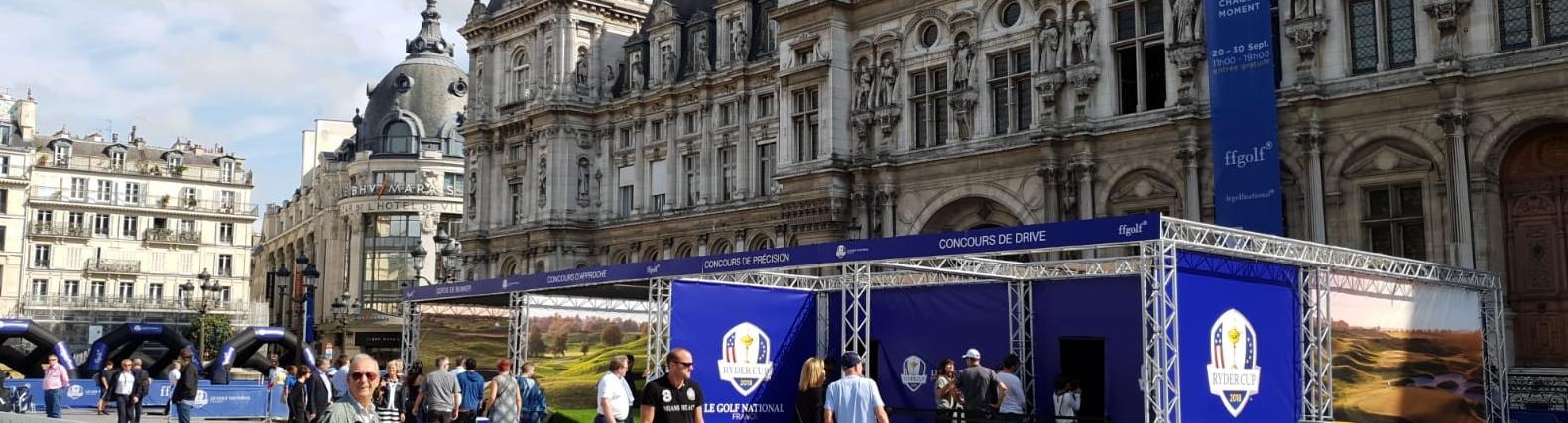 The Ryder Cup ‘downtown experience’ has been open for a week already outside the Hotel de Ville in central Paris. At 3,200 square metres which is full of activities from tee to green as well as means to communicate the excitement of the Ryder Cup, this fan experience is one of the most ambitious designs and build that Provision Events (PVE) has undertaken.