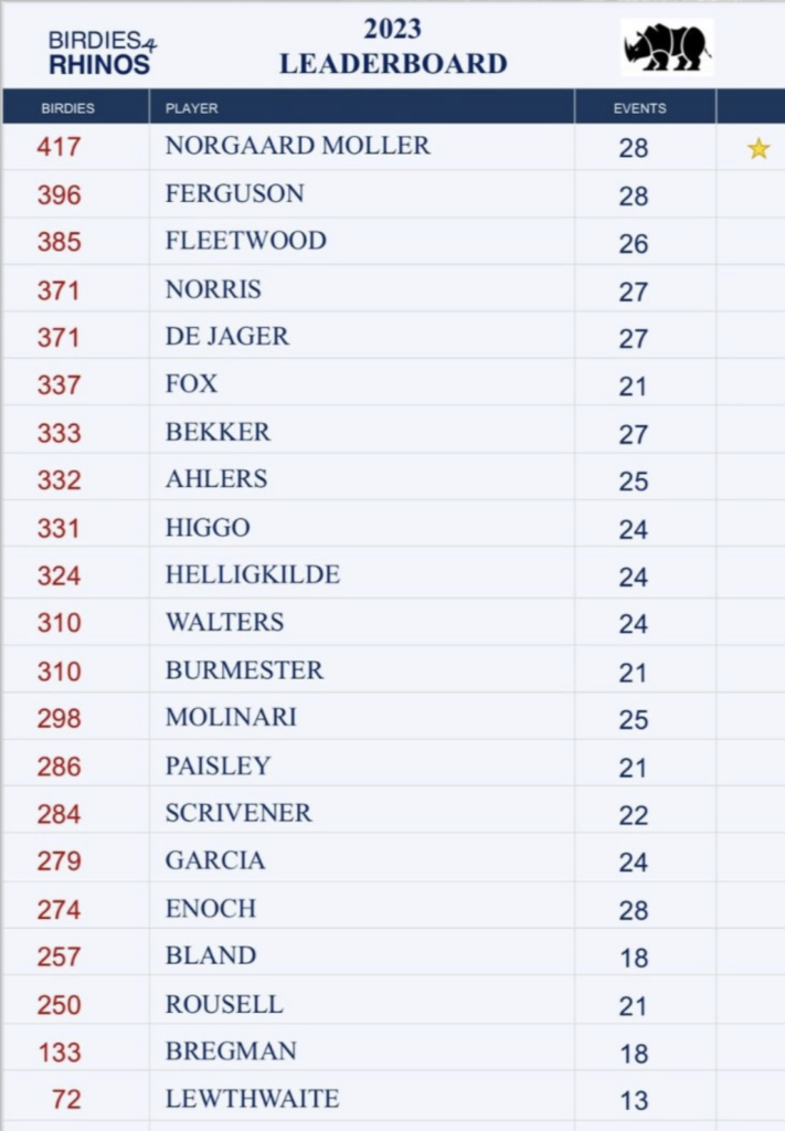 Denmark’s Niklas Norgaard Moller finished at the top of the 2023 Birdies 4 Rhinos leaderboard after amassing 417 birdies throughout the season, beating Ewen Ferguson by only 15 birdies. Fleetwood finished third with 385 birdies in his first year of taking part in supporting the charity.