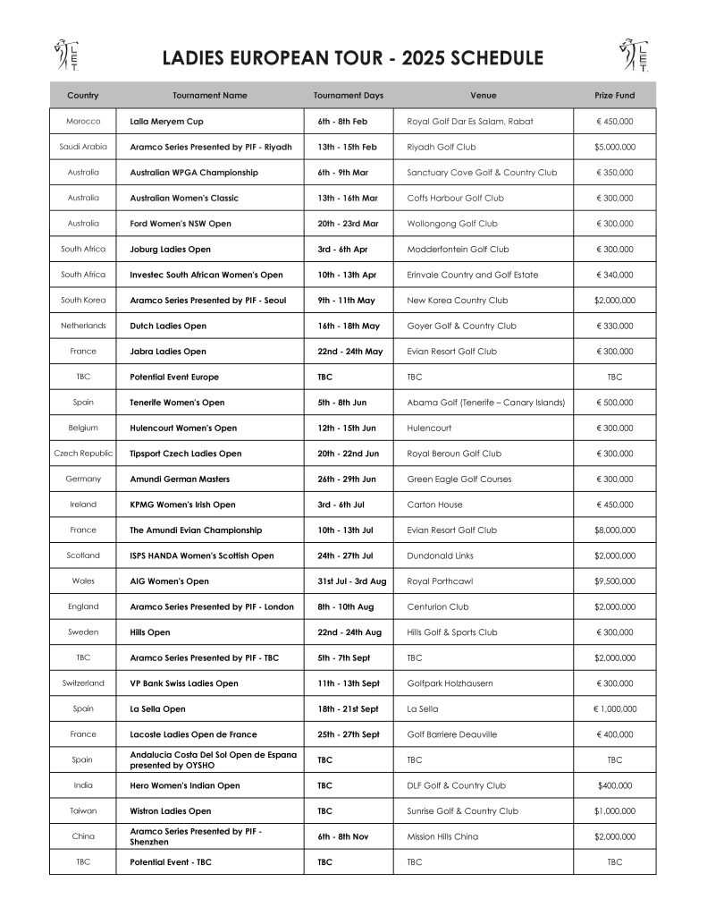 Then, in September, in a year that sees a Solheim Cup break, the LET will travel to the fourth Aramco Series event presented by PIF, then to the VP Bank Swiss Ladies Open, La Sella Open and Lacoste Ladies Open de France.