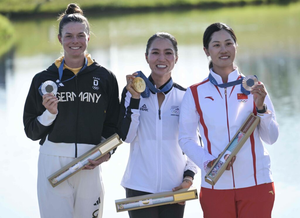 Rounding out the podium at the women’s Olympic golf event in Paris were Germany’s Esther Henseleit with silver and China’s Xiyu Lin with bronze.