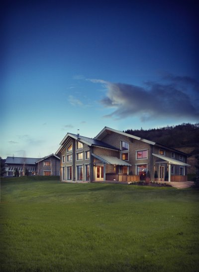 The lodge exteriors have been finished in a matt green colour and landscaped to minimise the impact on the surrounding UskValley.